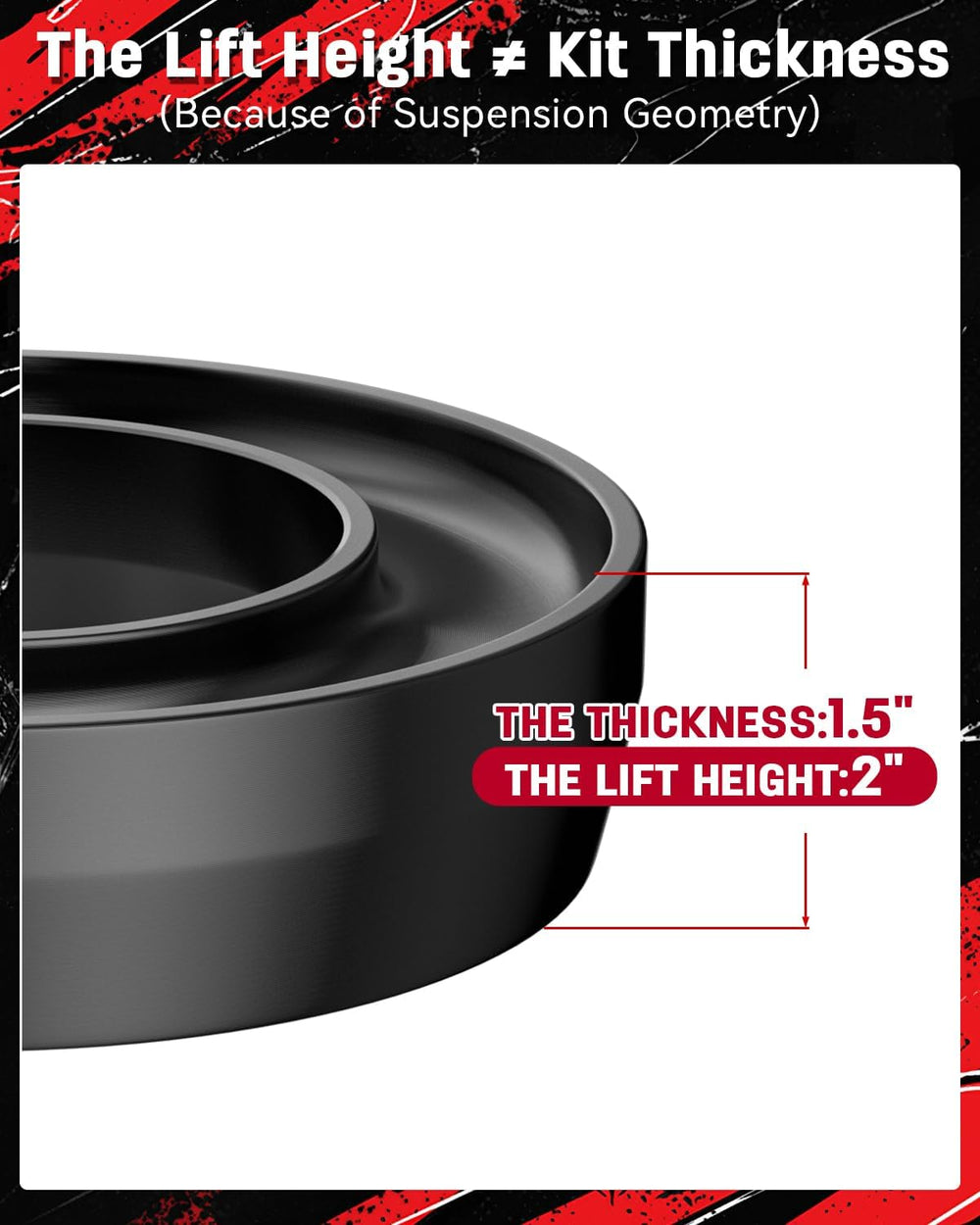*Note: Lifts the height of your truck, improving appearance and performance. Lift height and kit thickness ratio is not 1:1 due to suspension geometry.